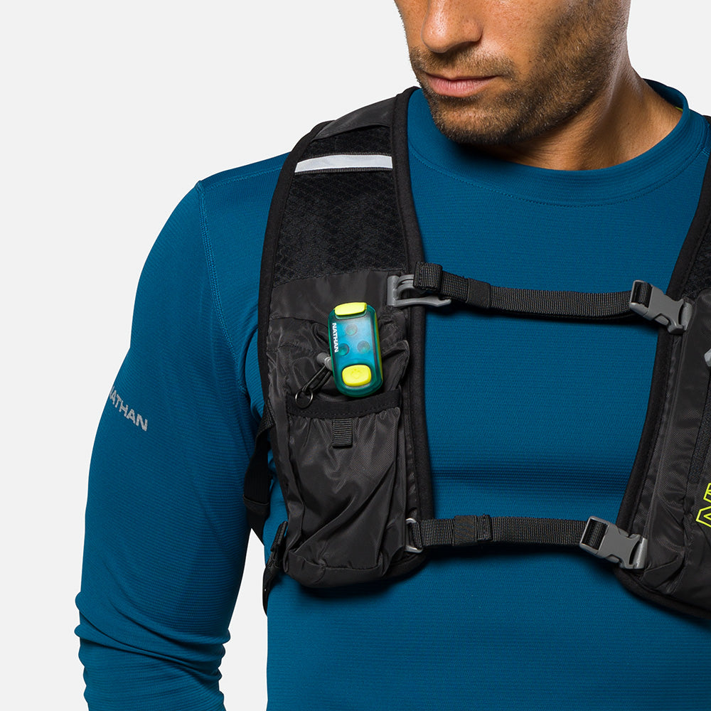 Clip on this bright, lightweight strobe—8 lumens, 110-hour flash mode, and weatherproof for any run.